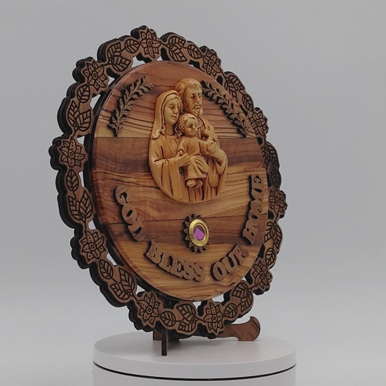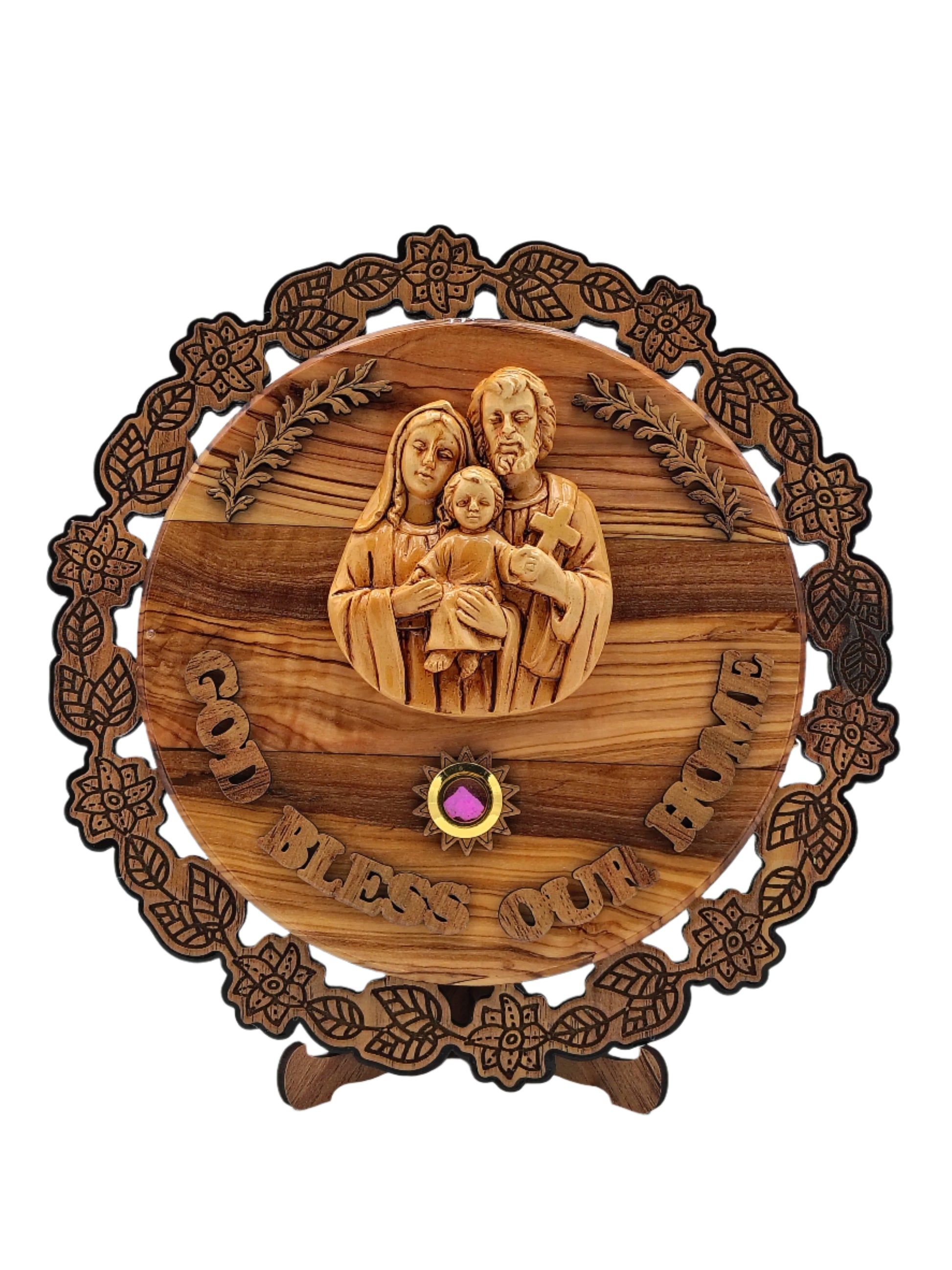 This handcrafted olivewood Holy Family plaque, made in Bethlehem, the Holy Land, features the words “God Bless Our Home” along with a star-shaped encasing filled with frankincense. A beautiful piece of faith and tradition, perfect for your home or as a thoughtful gift. (Stand not included).