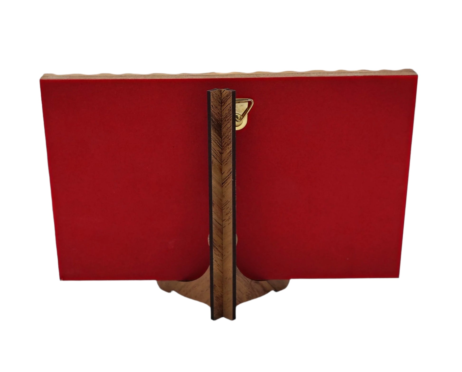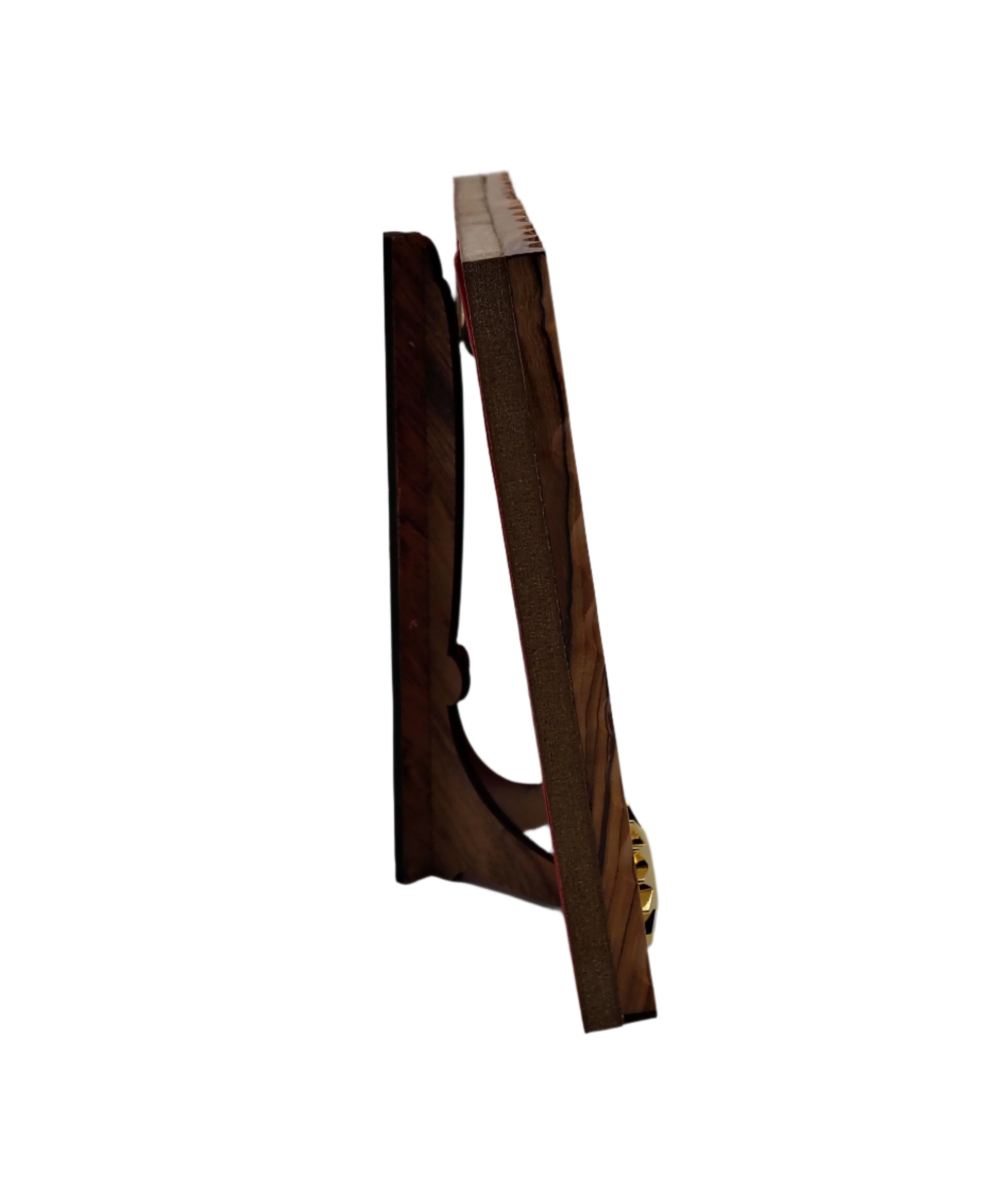 This exquisite olivewood plaque handcrafted in Bethlehem, the Holy Land, features a silver-plated depiction of the Last Supper, with the Jerusalem Cross on both sides. It also includes two star-shaped capsules—one filled with frankincense and the other with stones from Jerusalem—adding a sacred and meaningful connection to ancient Christian traditions. This unique piece is perfect for any spiritual space or home. (Stand not included).